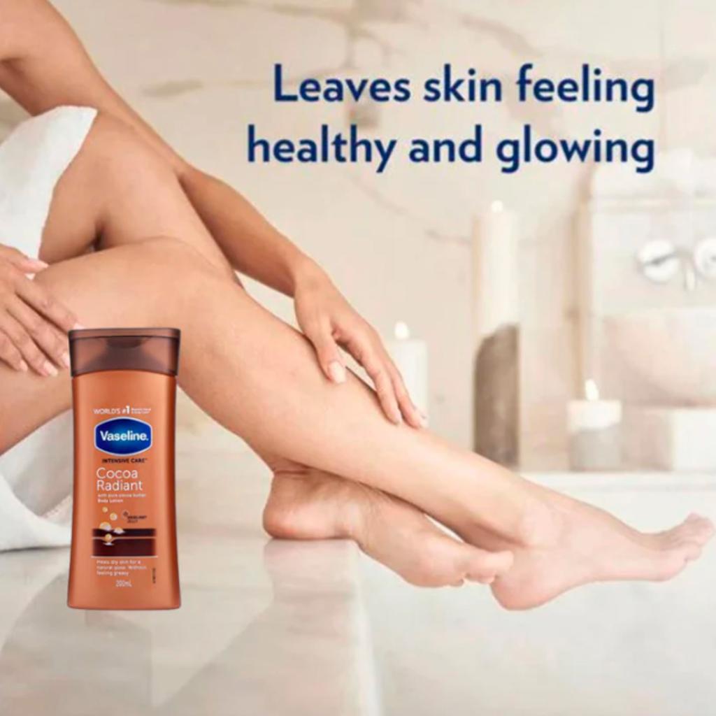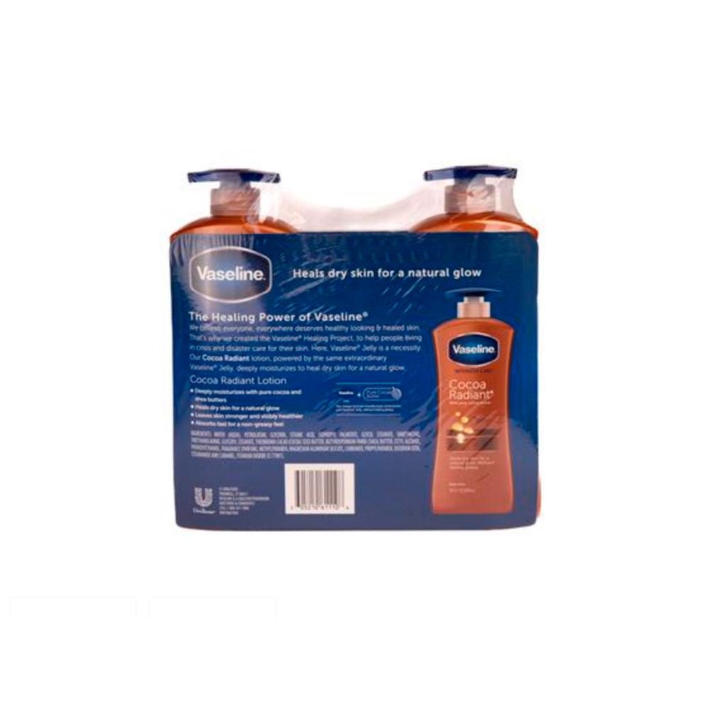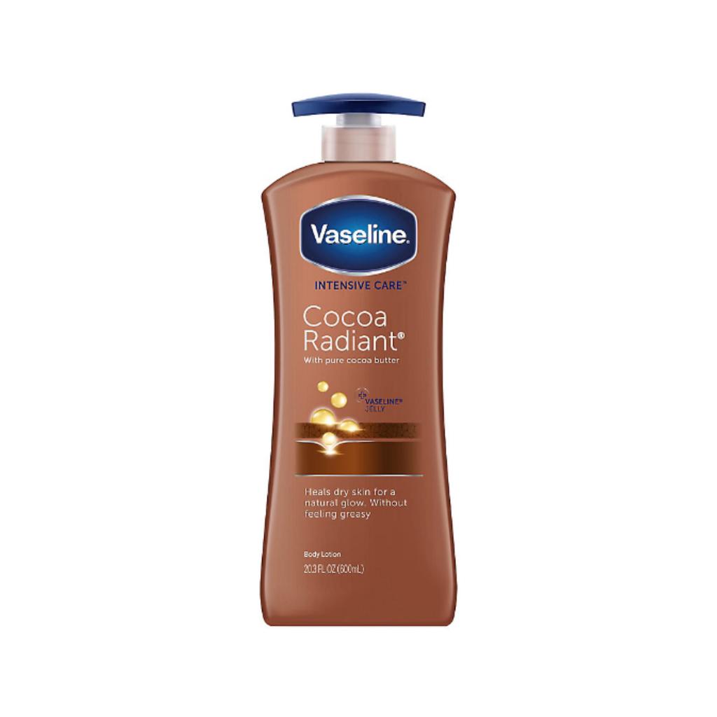 Vaseline's Intense Repair Lotion, with a total volume of 1.49 L / 50.6 oz, is formulated with 100% pure cocoa and shea butters. This body lotion, Cocoa Radiant Body Lotion, enhances the skin's natural glow. It is ideal for dry skin, providing non-greasy, nutrient-rich moisturization that contributes to skin healing.