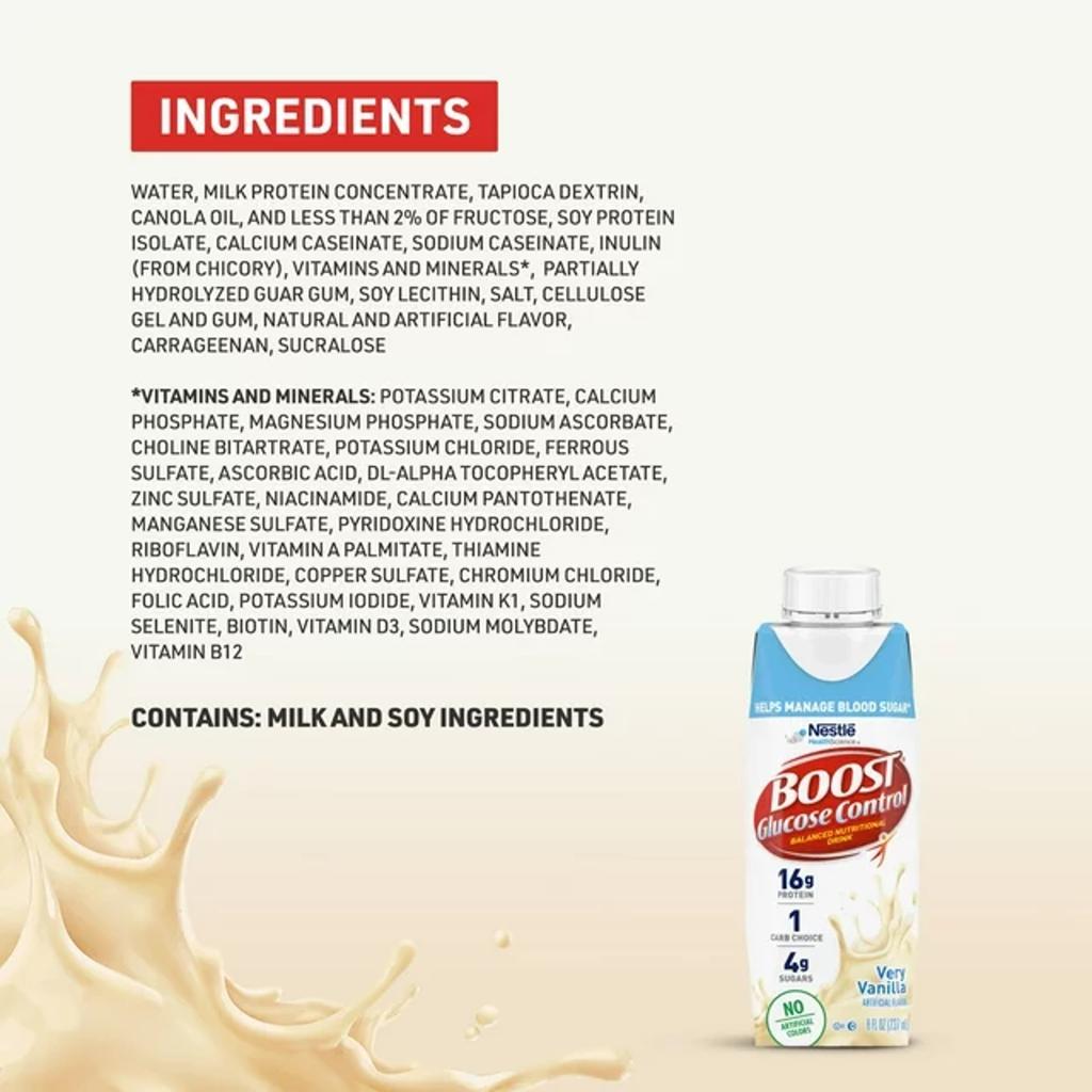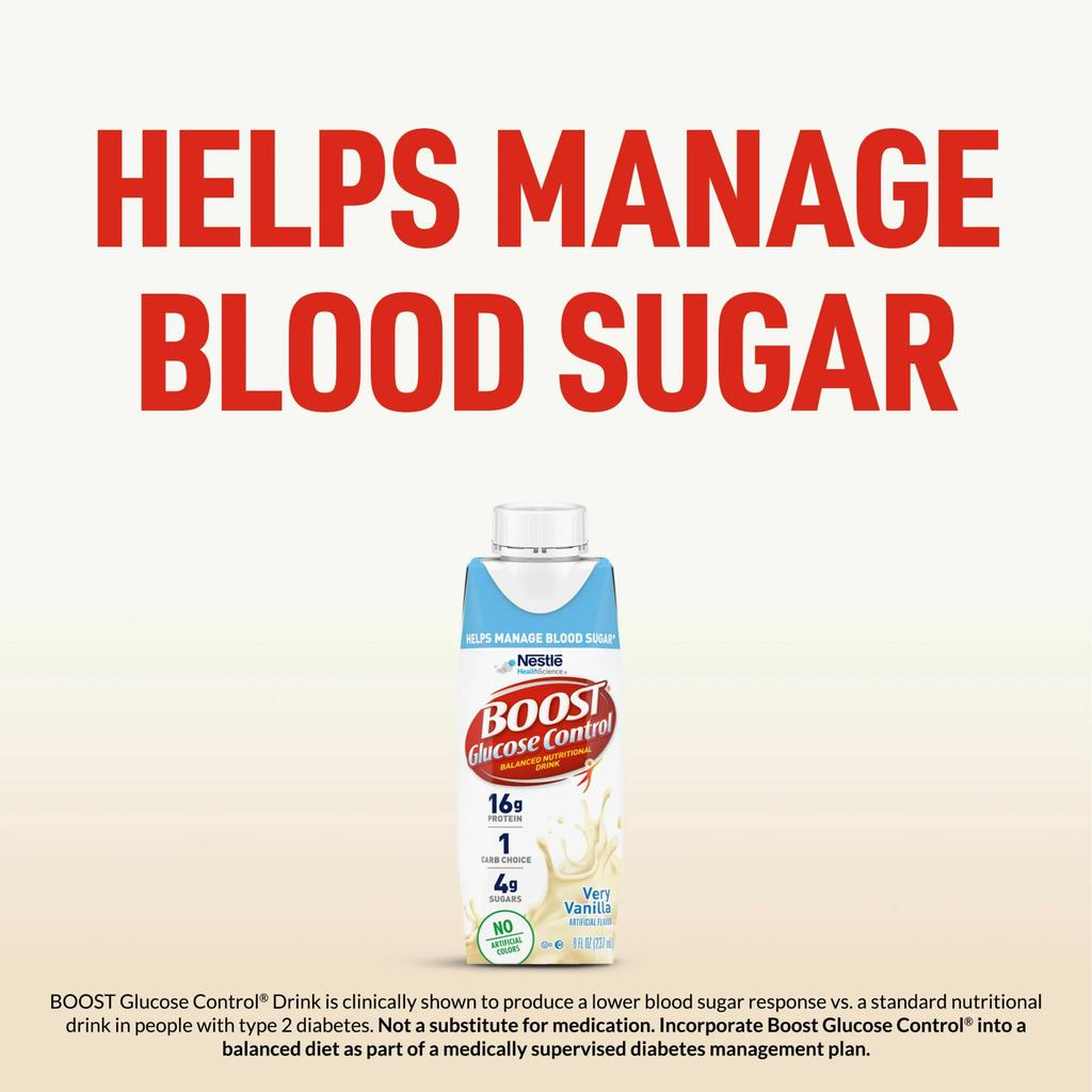BOOST Glucose Control High Protein Drink is clinically shown to produce a lower blood sugar response vs. a standard nutritional drink in people with type 2 diabetes. Not a substitute for medication. Incorporate BOOST Glucose Control High Protein Drink into balanced diet as part of a medically supervised diabetes management plan. 0 carb choices. Gluten Free. **FSC-Certified Packaging: This certification applies to the packaging only. It ensures that the boxes, wraps, or sleeves around your item are made with materials sourced from responsibly managed forests. It’s a small step that helps support healthier forest ecosystems, even when the product inside isn’t certified.