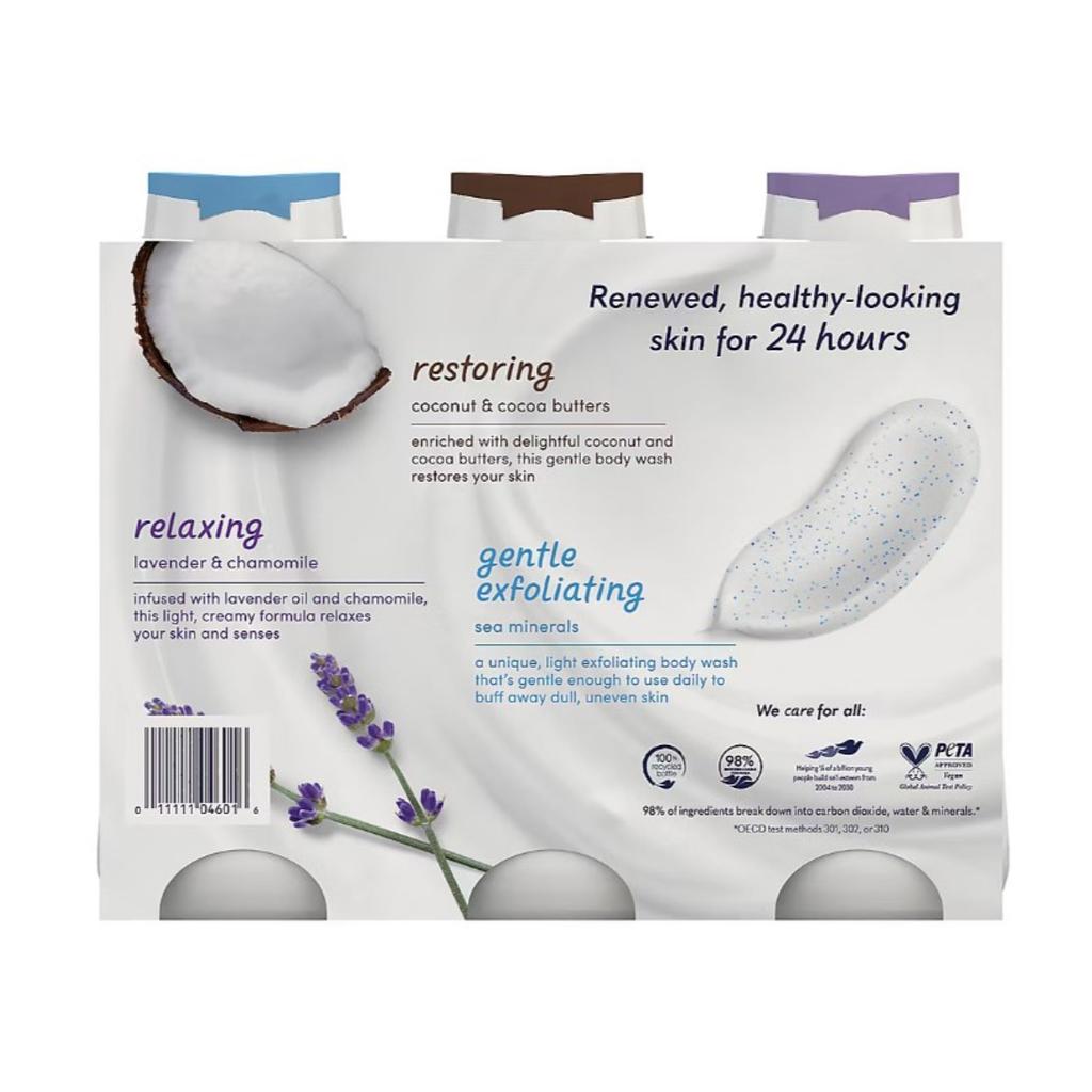 The Dove assorted liquid body soap pack, 680 mL 3-unit presentation, is designed to provide effective cleaning while nourishing the skin, removing bacteria and leaving an instant sensation of softness. Developed with renewing MicroMoisture technology, with vegetable moisturizers and a 98% biodegradable formula.