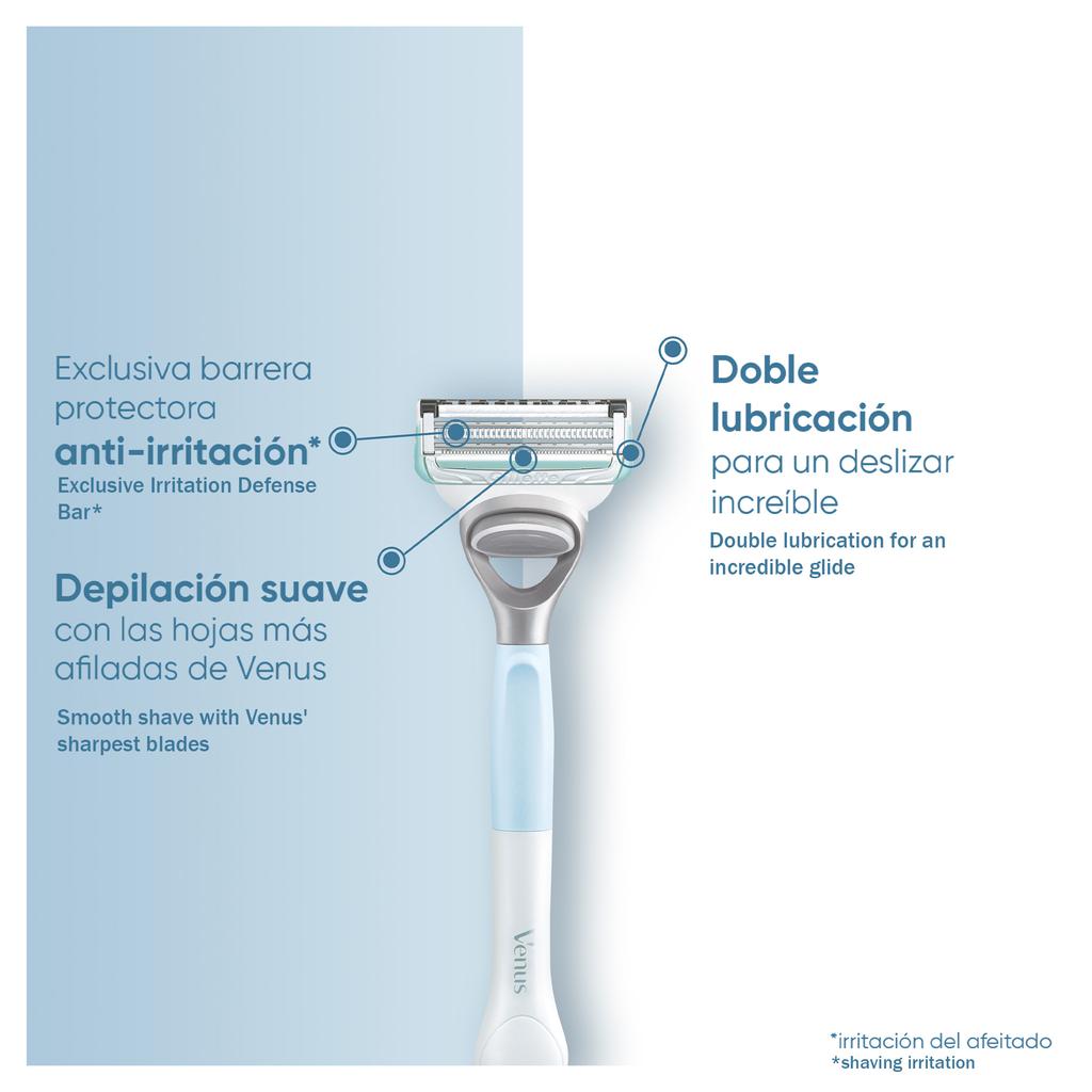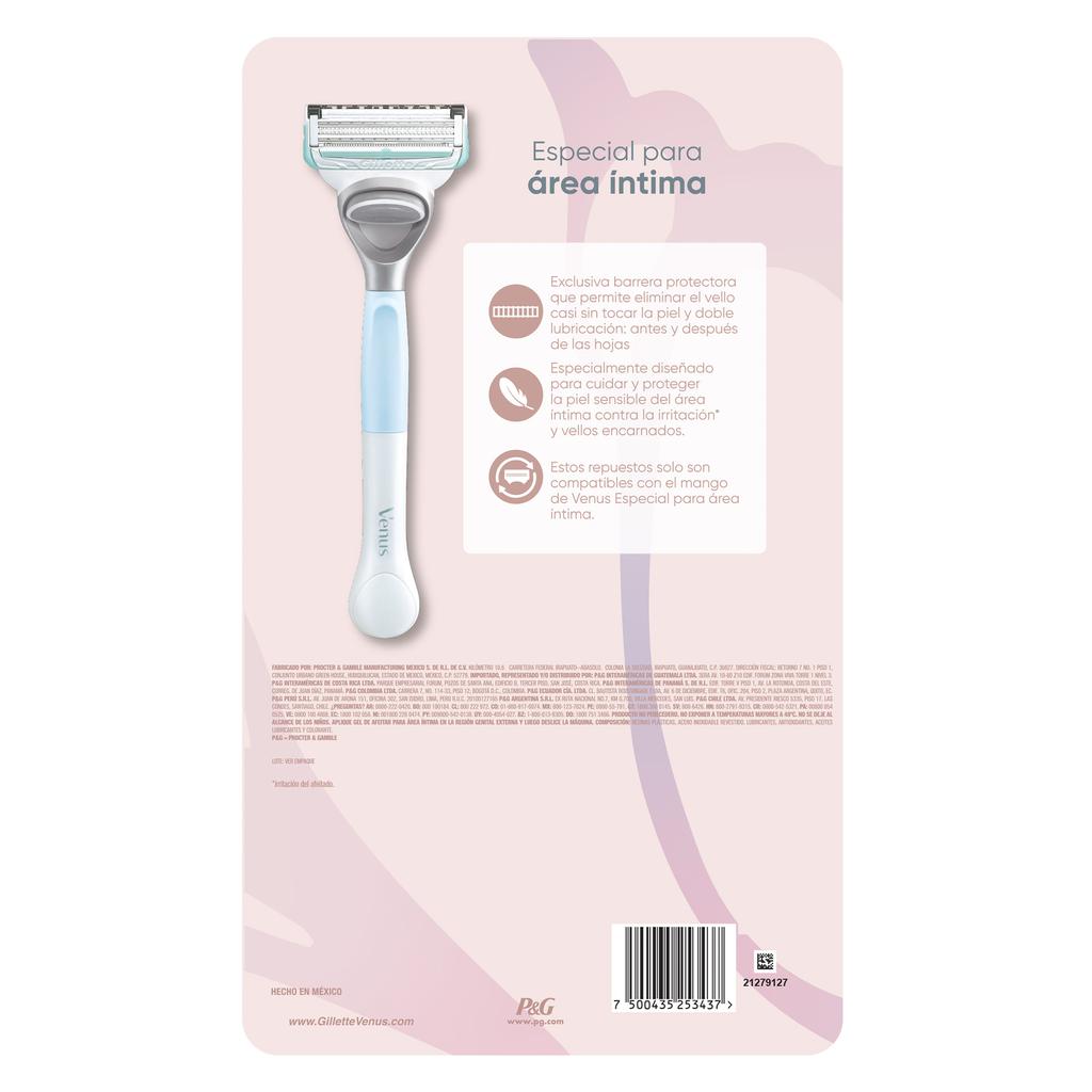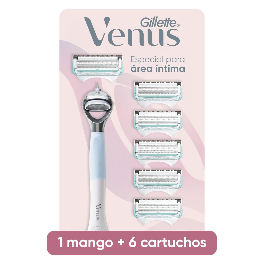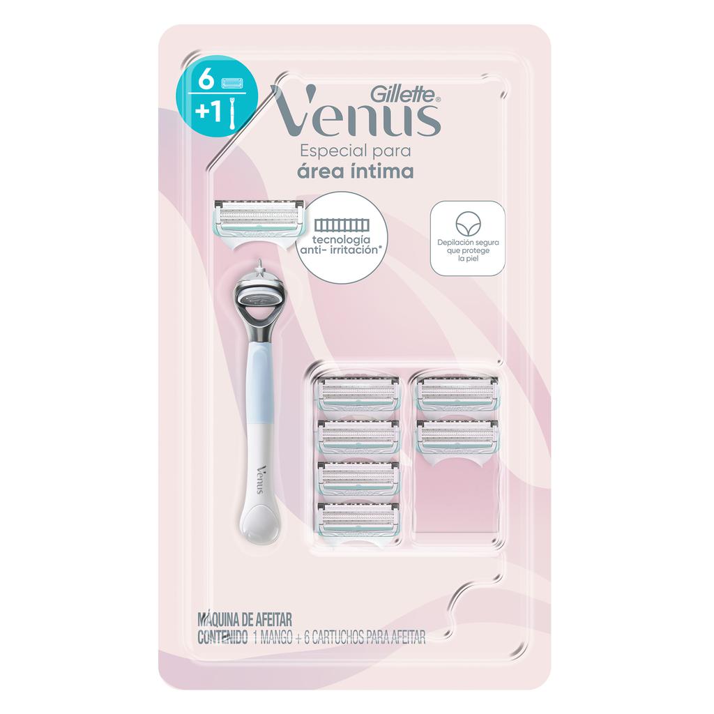 Gillette Venus Razor for Pubic Hair & Skin | Contains: 1 Handle and 6 Cartridges | Specially designed for the intimate area | Irritation Defense Bar for enhanced skin care | Lubrication strip with an indicator that changes color when the cartridge no longer provides an optimal shave | Three blades stronger than steel that stay sharp longer | Flexible head that adjusts to body contours for greater precision and comfort