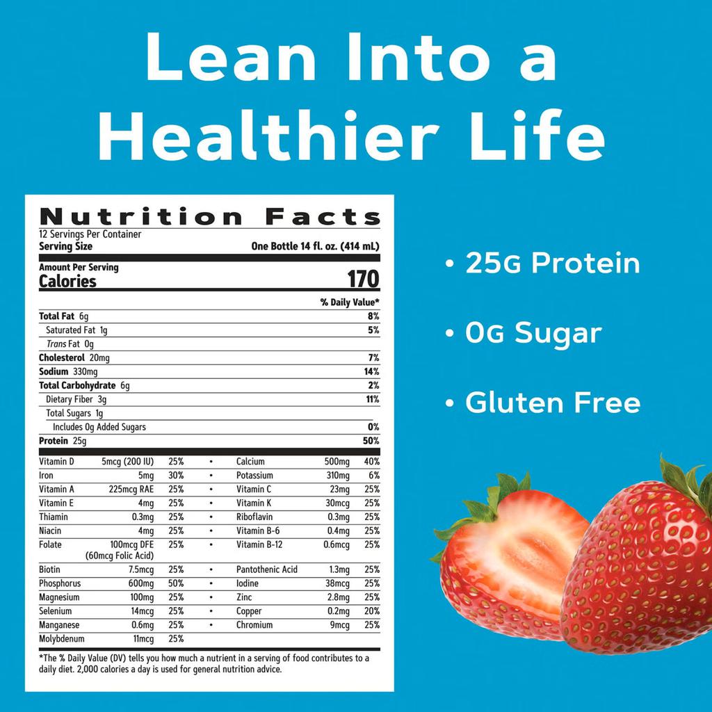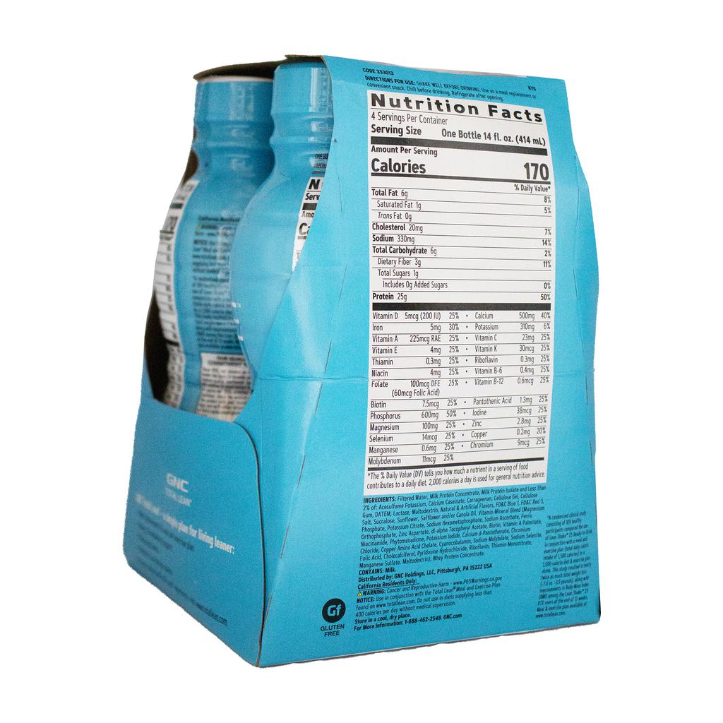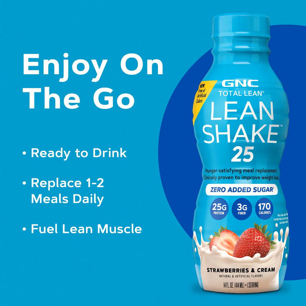 GNC Protein Shake with Strawberry & Cream Flavor | Country of origin: United States | Presentation: 4 units / 414 mL / 14 oz each | 25 g of protein per serving | 170 calories per serving | 3 g of fiber | Category: ready-to-drink protein shake | Brand: GNC Lean Shake | Storage: keep refrigerated.