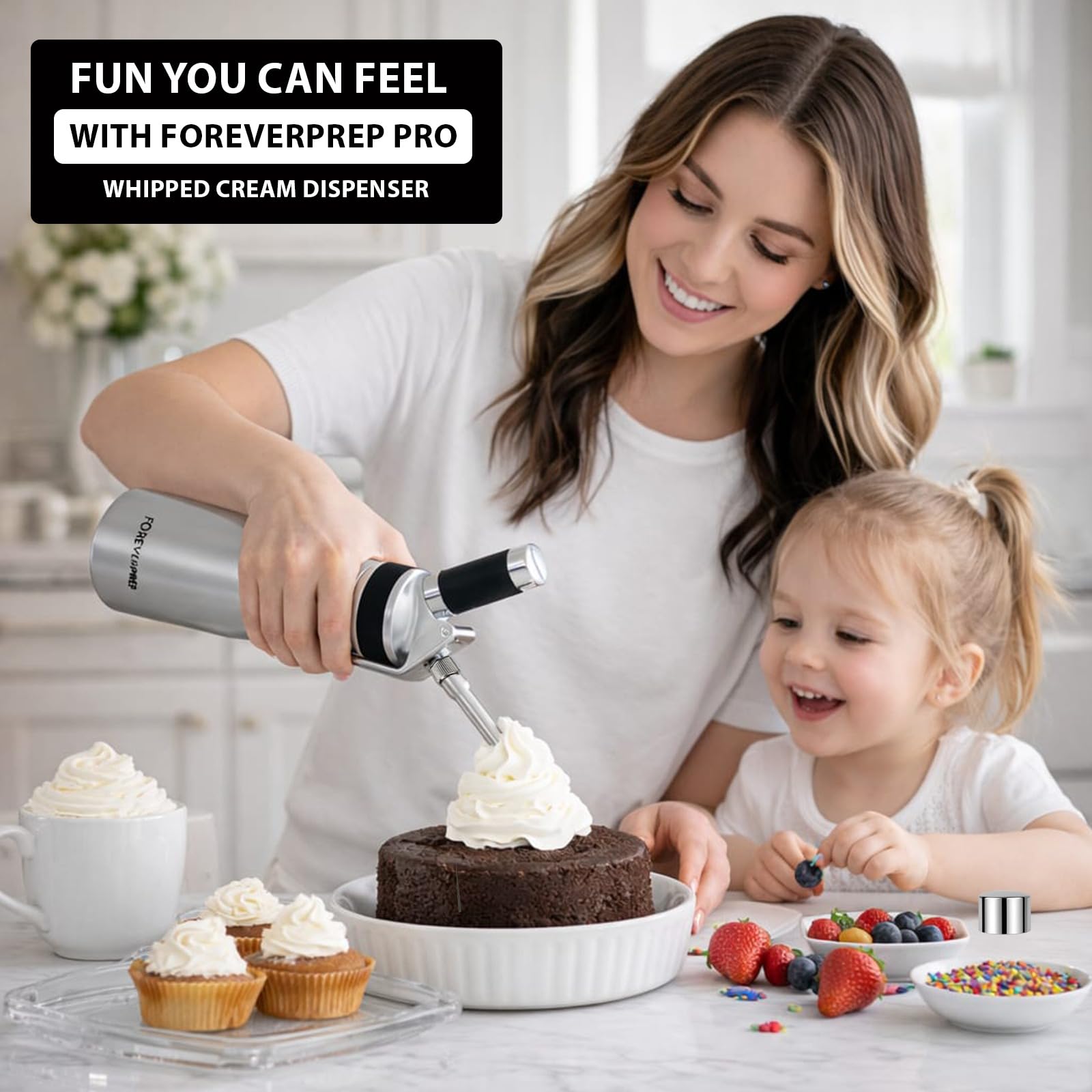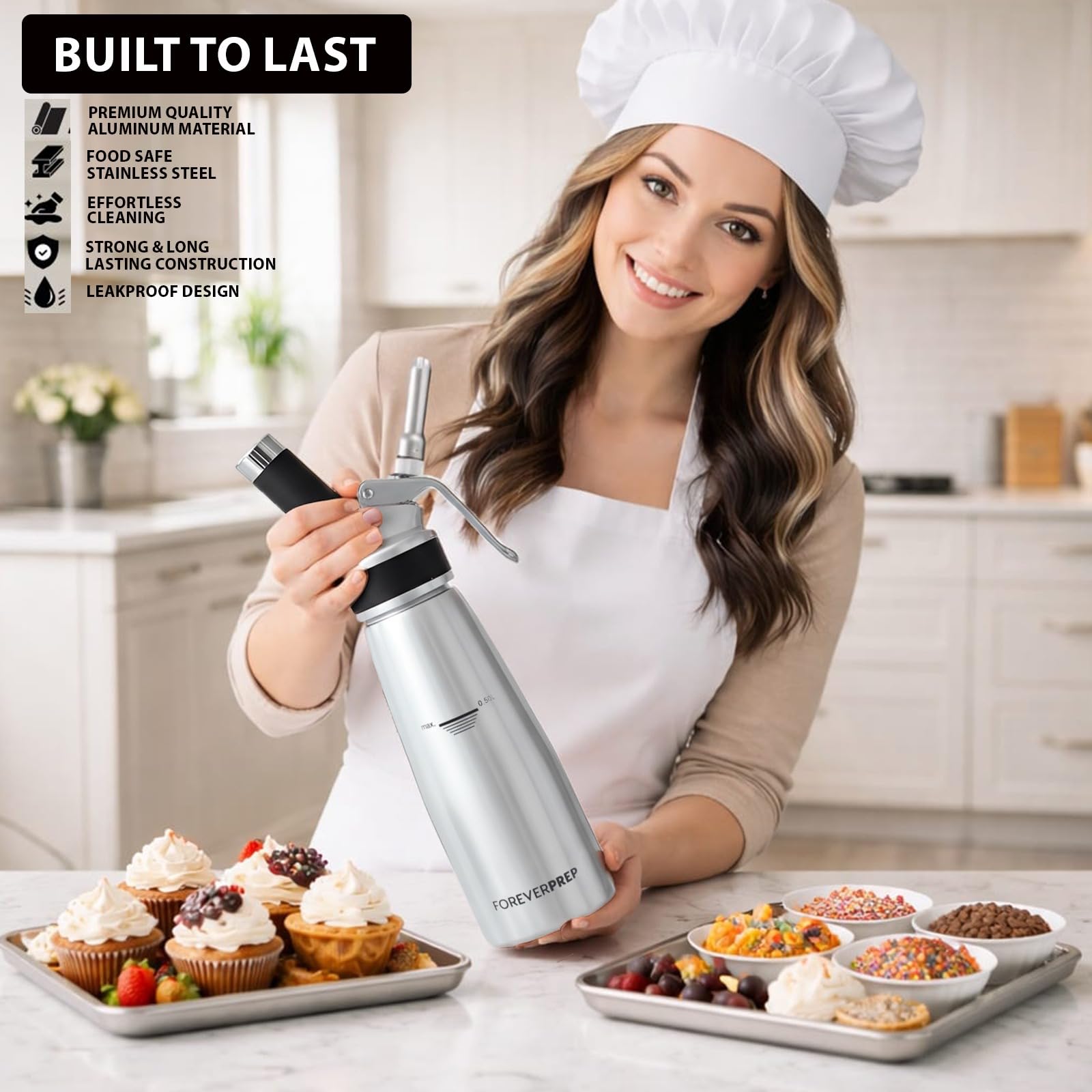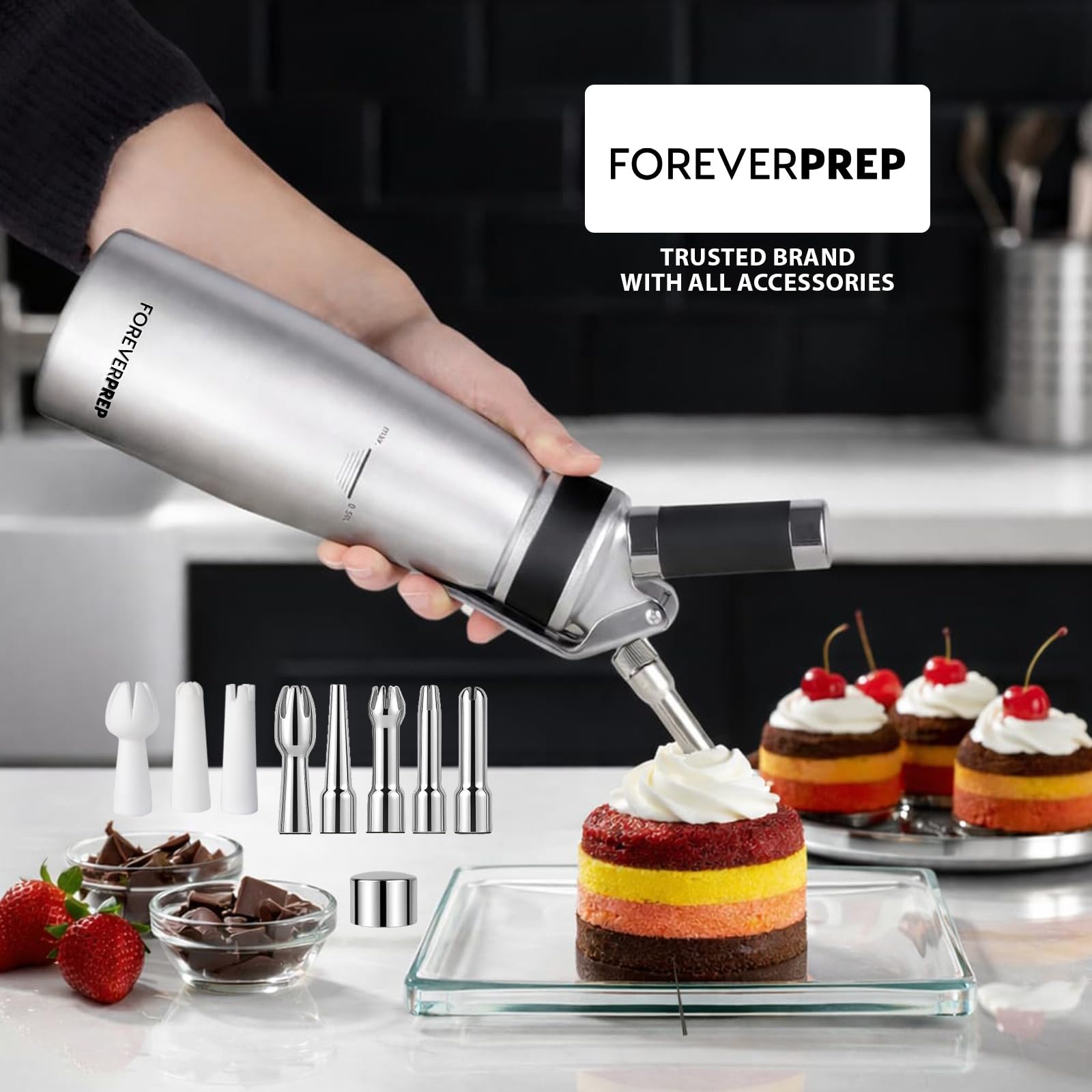 - BEST GIFT IDEA & 100% SATISFACTION GUARANTEED: This complete ForeverPrep professional whipped cream dispenser set makes a perfect gift for bakers, coffee lovers, home chefs, and dessert enthusiasts. A thoughtful, practical, and elegant gift choice for birthdays, holidays, housewarmings, or special occasions. Backed by a 100% Satisfaction Guarantee from Foreverprep Trusted Brand — and if you ever face any issue, you can return it within 30 days. so you can buy it with confidence.