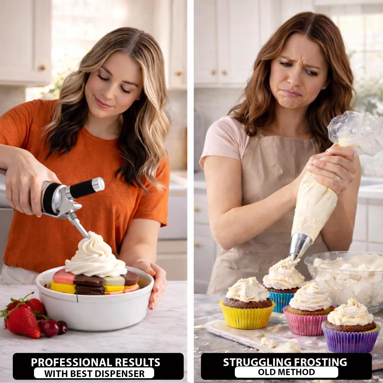 - PERFECT FOR ALL DESSERTS & BEVERAGES: Create bakery-style toppings for cakes, cupcakes, waffles, pancakes, hot chocolate, milkshakes, cold brew coffee, mousses, cheesecakes, and more. This whipped cream maker gives you light, airy, stable whipped cream in seconds — ideal for home bakers, coffee lovers, and professional kitchens