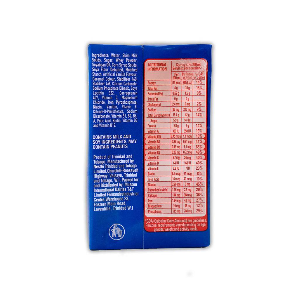 Water, Skim Milk Solids, Sugar, Whey Powder, Soyabean Oil, Corn Syrup Solids, Soya Flour Dehulled, Modified Starch, Artificial Vanilla Flavour, Caramel Colour, Stabilizer 460, Stabilizer 466, Calcium Carbonate, Sodium Phosphate Dibasic, Soya Lecithin 322, Carrageenan 407, Vitamin C, Magnesium Chloride, Iron Pyrophosphate, Niacin, Vanillin, Vitamin E, Calcium-D-Pantothenate, Sodium Bicarbonate, Vitamin B1, B2, B6, A, Folic Acid, Biotin, Vitamin D3 and Vitamin B12.